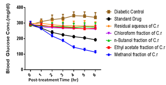 Fasting blood glucose concentration was first determined in overnight fasted mice by the enzymatic glucose oxidase method using a commercial glucometer (Accu-chek® Active, Roche diagnostic, Mannheim, Germany), following which the plant sub fraction was administered through oral/ intra-peritoneal routes. Blood glucose values were then estimated hourly for 6 hour.