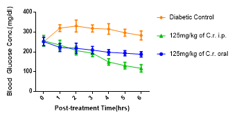 In order to compare the effect of oral and intra-peritoneal routes of administration of the most active 1st Sub-fraction of C. rutidosperma on fasting blood glucose level, 125mg/kg body weight of the sub fraction was administered to STZ-induced diabetic mice. Here, diabetes was induced as described previously [27]. Fifteen mice were randomly allocated to negative control and treatment groups of five mice each as follows: