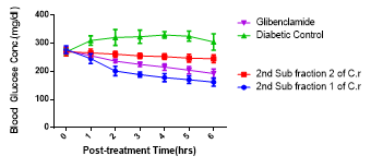 Shown in fig. 4 are the effects of the 2nd sub-fractions of C. rutidosperma (C. r.) and glibenclamide on fasting blood glucose level of STZ-induced diabetic mice. Comparatively, the 2nd sub-fraction 1 gave the highest glucose lowering effect for this plant