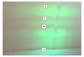 Plate 1: Preparative TLC fractionation of the Most Active 2nd Sub-fraction of C. rutidosperma, A= Origin, B= TLC fraction I(TLCFIC), C= TLC fraction II(TLCFIIC), D= Solvent front