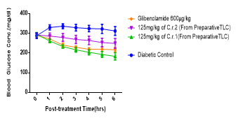 The effects of the constituent(s) of preparative TLC spots of C. rutidosperma (Plate 1) and glibenclamide on fasting blood glucose level of STZ-induced diabetic mice are shown in fig. 5. Significant (p< 0.05) reduction in FBG was demonstrated by TLCFIC.