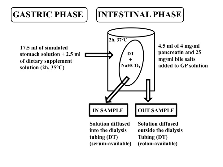 Simulated GI digestion of supplement water extracts was performed by the method of McDougall et al. [14] (fig. 1). Each supplement extract (2.5 ml) was added to the 17.5 ml simulated stomach solution (1.6 g pepsin, 1 g NaCl, pH 2). The mixture was incubated at 37 °C and 100 rpm in a shaking water bath for 2 h (Gastric Phase, fig. 1). The intestinal phase of the simulated GI was assembled as follows: the gastric phase solution was placed in a glass beaker along with 4.5 ml of a mixture of 4 mg/ml pancreatin, and 25 mg/ml bile salts and a segment of cellulose dialysis tubing (molecular weight cut off 12 kDa) containing 1M NaHCO3 to neutralize the titratable acidity was placed in the gastric phase solution and the beaker was incubated at 37 °C for 2 h. At the end of the incubation period, the solution in the beaker constituted the ‘OUT SAMPLE,' representing material that remains in the gastrointestinal tract (colon-available) and the solution that diffused into the dialysis tubing constituted the ‘IN SAMPLE,' representing the serum available material. All samples were centrifuged at 16,000 rpm, filtered through 0.45 μm nylon syringe filters and stored at-20 °C for further analyses.