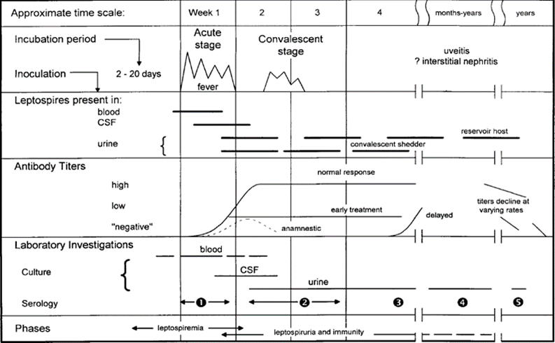 Fig. 1: Schematic representation of the biphasic nature of leptospirosis and relevant diagnostic investigations at different stages of disease. For serology specimens 1 and 2 are acute-phase specimens, 3 is a convalescent-phase specimen which may facilitate detection of a delayed immune response, 4 and 5 are follow-up specimens which can provide epidemiological information, such as the presumptive infecting serogroup. This fig. was from [1]