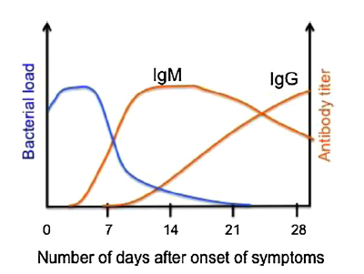 The antibodies usually develop within 2-12 d after the onset of illness. IgM antibody starts appearing early in the course of the disease and reaches detectable levels within one week or as early as on the third or fourth day of illness. They reach peak levels during the third or fourth week and then decline slowly over months and become undetectable within six months (fig. 2). However, rarely IgM may persist at a low level for several years [9]. IgG antibodies appear later than IgM and reach peak level after few weeks of illness and may persist at a low level for years [9].
