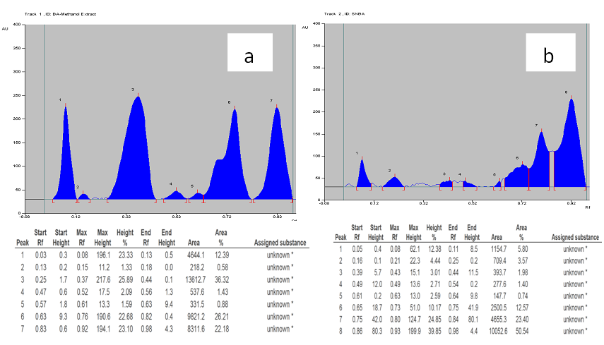 Fig. 1: HPTLC fingerprinting of phenolic acids present in B. alba extract (a) synthesized AgNPs (b)