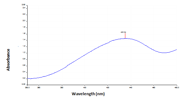 Figure 2 shows UV-Vis spectra of aqueous extract of B. alba with 3 mM silver nitrate solution. The colour of the solution changes from straw yellow to golden yellow due to reduction of silver ion, which indicates the formation of silver nanoparticles. UV-Visible absorption spectra of silver nanoparticles showed a maximum absorbance of 435 nm.