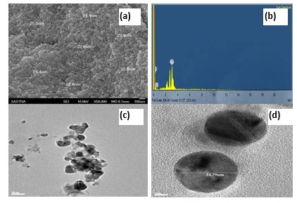 According to Scanning electron microscope (SEM), the size of the agglomerated nanoparticles ranges from 22.6 to 25 nm (as shown in Figure 5-a). Energy dispersive spectroscopy (EDS) analysis confirmed the presence of elemental silver signals of the nanoparticles (Figure 5-b). Strong signals of metallic silver and other elemental weak signals (O, N) are recorded in the energy of 3Kev. The morphology and coating of bio-molecules over the nanoparticles was observed by transmission electron microscope (TEM). Representative TEM image of AgNPs shows the particles were in nano range with a mean diameter of 24.79 nm and the particles were spherical in shape (Figure 5-c,d).