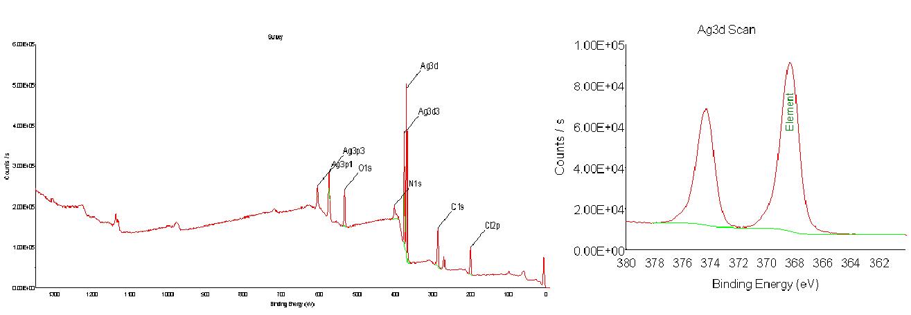 The XPS spectrum displays silver signal of the nanoparticles (Figure 6). The general scan spectrum shows the presence of strong Cls, Ols, Nls, and Ag3d core levels (shown in Figure 6-a). The Ag3d core level spectrum (shown in Figure 6-b) is resolved into two spin-orbit components, which occurred at binding energy of 368.0 and 375.0ev respectively.