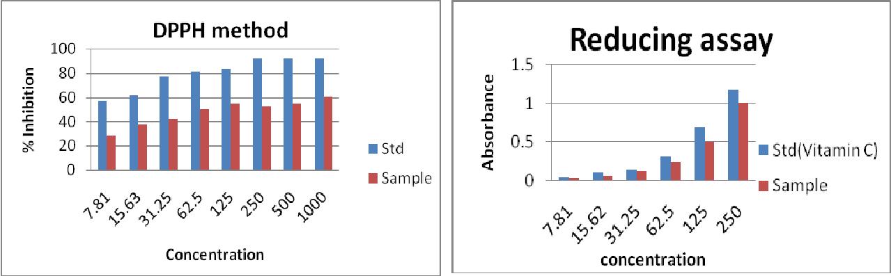 The antioxidant activity of Silver nanoaparticles was evaluated using DPPH (2, 2-diphenyl-1-picrylhydrazyl) and reducing assay. As shown in Figure 7, DPPH free radical scavenging activity of synthesized AgNPs showed a potent inhibitory effect when compared with Gallic acid as a standard ranging from 7.81µg/ml to 1000µg/ml. The percentage inhibition of free radical gets increased with increase in concentration of substrates. The IC50 value of nanoparticles was found to be 62.5µg/ml. Figure 7 also shows the reducing ability of silver nanoparticles compared with ascorbic acid (Vitamin c) as standard. The reducing power of nanoparticles was found to be effective and increased with an increase in concentration.