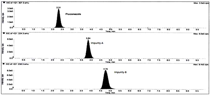 The analytical column used in LC/MS/MS was Hypersil BDS C18 (100 mm x 4.0 mm) 3 µm column (Thermo Co, USA) in isocratic mode. 5 mmol ammonium acetate and acetonitrile in the ratio of 65:35 (v/v) was used as a mobile phase. The flow rate was 0.4 ml/min, with the flow rate split down to 0.1 ml/min into the MS source. The column oven temperature was maintained at 40 °C; the sample cooler temperature was 5 °C and the wavelength were set at 260 nm. The injection volume was 10 µl. Positive ion electrospray ionization probe in multiple reaction monitoring (MRM) modes was used in MS method for quantification of impurities in fluconazole drug substance. In this method impurity-A was monitored with its molecular ion [M+H]+ m/z 224.2 and daughter ion m/z 127.2 (224.2-127.2); impurity-B was monitored with its molecular ion [M+H]+m/z 238.2 (protonated) and daughter ion m/z 141.2 (238.2-141.2) and fluconazole was monitored with its molecular ion [M+H]+m/z 307. The ion spray voltage (V), declustering potential and entrance potential was kept as 4500 V, 50 V and 10 V respectively. The ion source gas 1 and ion source gas 2 nebulization pressures (psi) were maintained at 35, 30 and 14 respectively. This method is suitable for the quantification of impurity A and impurity B both in reaction monitoring samples as well as fluconazole active pharmaceutical ingredient.