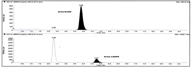 Fig. 4: LOQ chromatograms of impurity-A (above) and impurity-B (below)