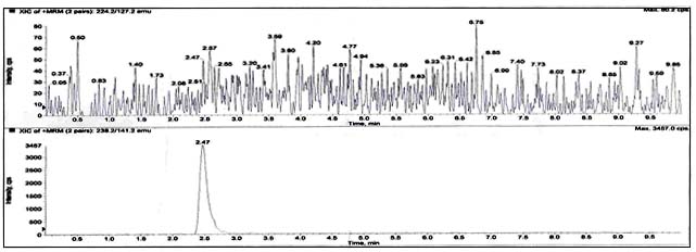 The limit of detection (LOD) and limit of quantification (LOQ) were calculated from S/N (signal to noise) ratios. In this process the concentrations were reduced sequentially, such that they yield S/N ratio as 9.7 and 10.1, respectively, for impurity-A and impurity-B. The LOQ of 0.3 µg/g is typical for the impurity-A and impurity-B, with a LOD of 0.1 µg/g approximately three times less than LOQ. The precision of six injections of a sample containing 0.3 µg/g of impurity A and impurity B (with respect to the API concentration 5 mg/ml) at LOQ level was below 1.5% RSD. The determined LOD, LOQ chromatograms and LOQ spiked chromatograms are shown in fig. 3-5. The found LOQ values are sufficient to quantify these impurities at ultra-level in the fluconazole API as per the limits defined by pharma regulating agencies. As per the literature survey, no high-performance liquid chromatography method has been found for the determination of these potential impurities in fluconazole active pharmaceutical ingredient. Al-Rimawi [23] described a high-performance liquid chromatography-ultraviolet (HPLC-UV) method for the detection of other related compounds at 260 nm which, unfortunately, is not sensitive enough to quantify the impurities in the µg/g range. But the present LC/MS/MS method offers great sensitive detection of impurities at 0.1 µg/g (0.5 ng/ml), when compared to a high performance chromatography technique of the detection limit of 100 µg/g (1 µg/ml). Existing methods such as HPLC with UV detection and GC with FID detection have some drawbacks as retention times can vary, uncertainty can arise as to whether a peak at a new retention time is a new impurity and these methods certainly needed some other method to characterize the impurities online. But the current developed LC/MS/MS method can directly use to quantify impurities at lower levels without above mentioned difficulties.