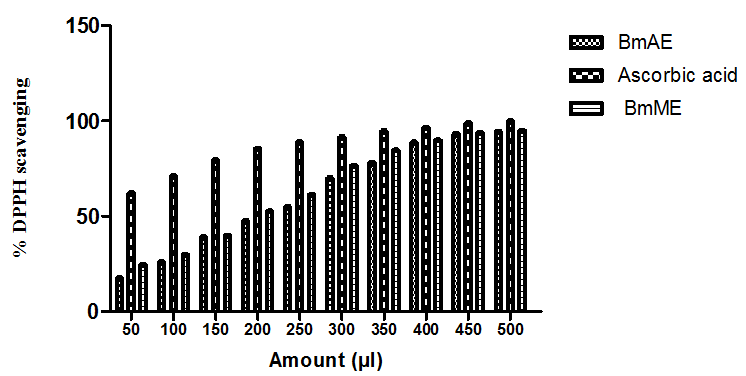 BmAE, BmME and the standard ascorbic acid were checked for their antioxidant potential on the basis of free radical scavenging effect of stable DPPH according to the protocol of Goveas and Abraham. With minor modifications [41]. A range of diluted working solutions of the BmAE and BmME were prepared in distilled water and methanol respectively. The aqueous solution of ascorbic acid (1 mg/ml) was also prepared for the comparative analysis. DPPH (0.1 mmol) was prepared in 80% methanol and 500μl of this solution was mixed with 500μl of serially diluted sample and standard ascorbic acid solutions separately. The obtained reaction mixtures were kept in dark for 15-30 min and absorbance was recorded at 517 nm spectrophotometrically. DPPH solution was used as control and the range of diluted BmAE and BmME was taken as blank. The absorbance was recorded and DPPH scavenging was calculated using the formula given below: