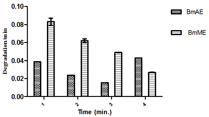 The UV absorption of hydrogen peroxide can be measured at 240 nm, whose absorbance decreases when degraded by the enzyme catalase. From the decrease in absorbance, the enzyme activity can be portrayed as the concentration of hydrogen peroxide is decreasing significantly in dose-dependent manner. The 100% hydrogen peroxide was degraded to 75.16246±0.0063% and 71.58474±0.0067% when initially small amount of BmAE and BmME was added to the cuvette respectively. Degradation per minute observed upto 10 min and finally there was approximately 7.889728±0.0068% and 2.229903±0.0059% radical was remained (fig. 3).
