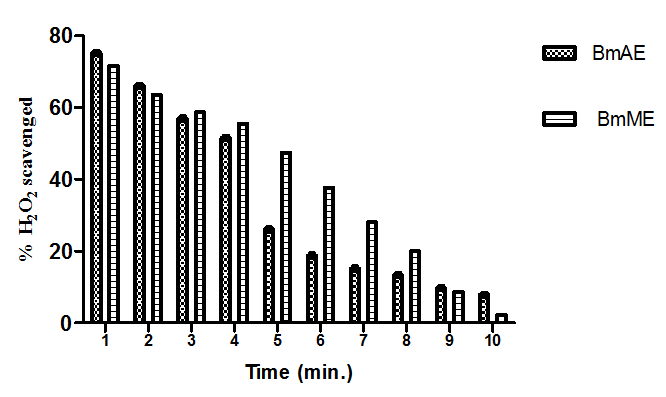 SOD molecules are known to convert superoxide free radicals to hydrogen peroxide and molecular oxygen. It is a major defense for aerobic cells in combating the toxic effects of superoxide radicals. They belong to a large family of isoenzymes that mediate cellular response to oxidative stress and represent the main enzymatic source of peroxides. The degradation of superoxide radicals per minute was evaluated and this radical was degraded on an average unit of 0.006 by BmAE and 0.023 units by BmME (fig. 2).