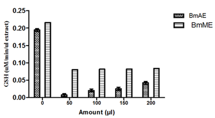 Glutathione peroxidase catalyses the reduction of hydrogen peroxides by reduced glutathione (GSH) and functions to protect the cell from oxidative damage. GSH is the important part of non-enzymatic antioxidants and it can remove peroxy nitrite (ONOO-) with the formation of oxidized glutathione (GS-SG), which is converted back into GSH by NADPH-dependent glutathione reductase. Reduced glutathione on reaction with DTNB (5, 5'-dithiobis nitro benzoic acid) produces a yellow coloured product that absorbs at 412 nm. DTNB was used as control and the DTNB with different concentration of BmAE and BmME was used as test sample. The concentration of GSH was expressed in µM/min/µl extract and estimated upto 200 µl of both extracts. GSH was found in low concentration at 50 µl and in high concentration at 200 µl volume of both BmAE and BmME (fig. 4).