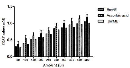 The antioxidant potential of BmAE and BmME was assessed based on the Ferric Reducing Antioxidant Power (FRAP) assay by the method of Sudha et al. with minor modification [45]. A total of 75 µl of BmAE and BmME and 225 µl of DW and methanol respectively were added to 1.5 ml of freshly prepared FRAP reagent [10 parts of 300 mmol sodium acetate buffer of pH 3.6, 1 part of 10 mmol 2,4,6-tri (2-pyridyl)-s-triazine (TPTZ) solution and 1 part of 20 mmol FeCl3.6H2O]. The reaction mixture was incubated in the dark for 4 min. The increase in absorbance with the formation of colored product (ferrous tripyridyltriazine complex) was recorded at 593 nm. FRAP working solution was taken as blank. The antioxidant capacity of the BmAE and BmME was determined based on a calibration curve plotted using FeSO4.7H2O at a concentration ranging between 0.125 and 2 mmol taking the concentration of FeSO4.7H2O mmol on x-axis and the absorbance at 593 nm on y-axis. Results were expressed in mmol Fe (II)/g of extract. The relative activity of the extracts was compared to standard ascorbic acid and analysed in parallel. Absorbance of each diluted extract and standard were expressed in mmol of FRAP value.