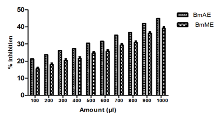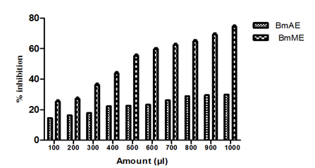 Results exhibited significant anti-proteinase activity at different concentrations of BmAE and BmME. The BmAE demonstrated the highest percentage proteinase inhibition of 29.94818±0.0071 % and the lowest of 14.47679±0.0082% while BmME resulted in maximum proteinase inhibition of 74.337±0.0073% and minimum inhibition of 25.327±0.0079% at extract volume or amount of 1000 µl and 100 µl respectively (fig. 7).