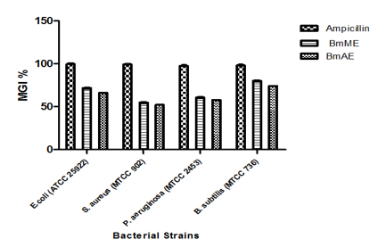 Antimicrobial assay of the aqueous extract was examined against various bacterial strains by accessing the percentage inhibition in presence of B. compared to the control where only media and cultures were added. The results suggested that BmAE and BmME exhibits bactericidal property in vitro i.e. the growth of microorganisms was inhibited in its presence. It was found that BmAE was most effective against B. subtilis with %MGI of 73.912±0.0069% and was least effective against S. aureus with %MGI of 52.0487±0.0063%. BmME showed maximum %MGI of 79.89877±0.0081% against B. subtilis whereas least against S. aureus i.e. %MGI of 54.789±0.0076%. Whereas, synthetic antibiotic ampicillin showed almost complete inhibition against all the strain at the final concentration of 0.5 mg/ml (fig. 8).