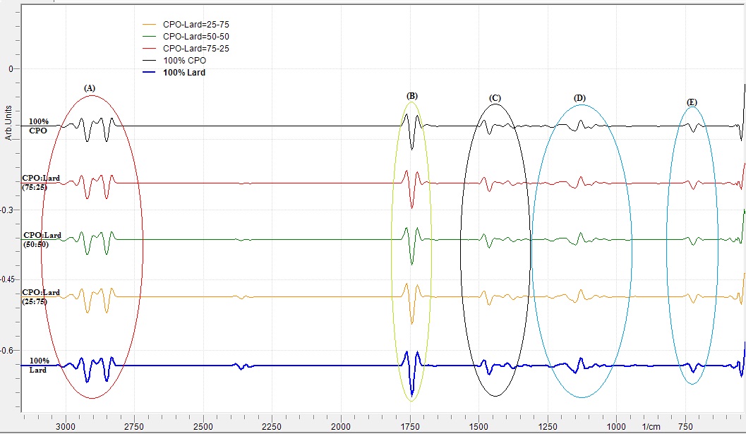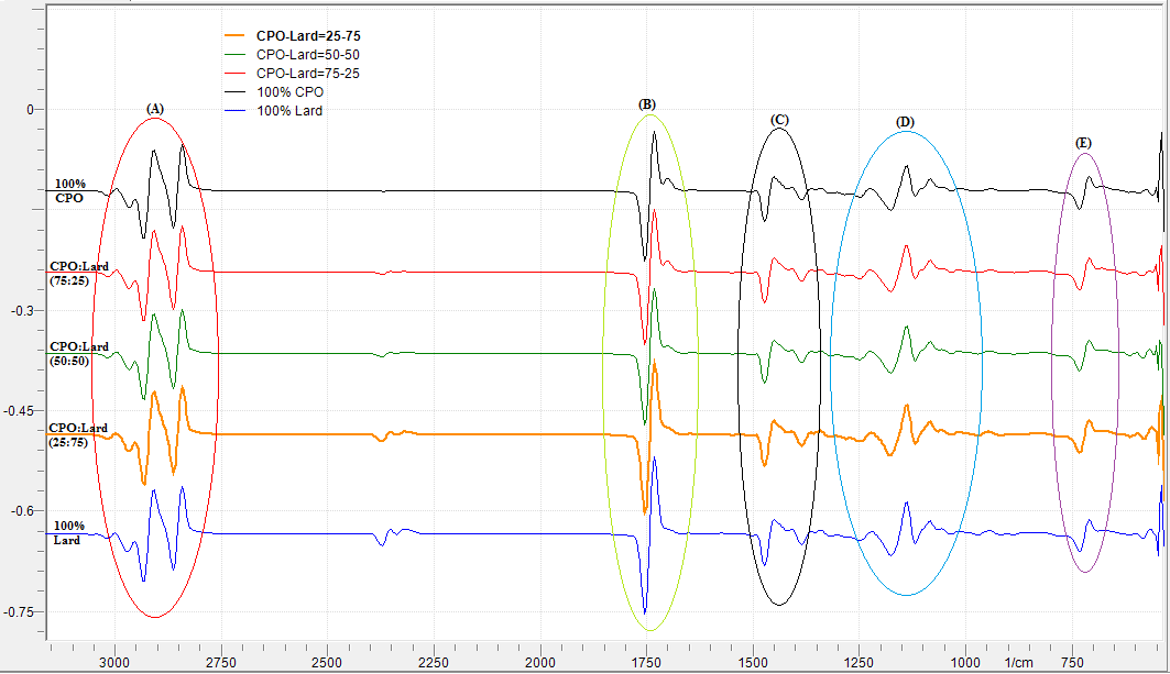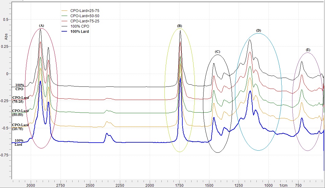 The FTIR spectrum of lard and CPO has different. It has seen of some wave number areas is A) wave number 2990-3045 cm-1 is characteristic vibrations of functional groups alkane and alkene group, B) from 1749 to 1650 cm-1 that the vibration of carbonyl functional group, C) and D) 1481-999 cm-1 which both are FTIR fingerprint area, and E) wave number of 779-650 cm-1 is a vibrational of functional group for the double bond in the cis or trans form.