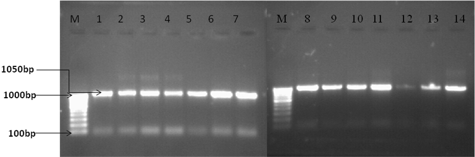 Lane M- Marker 100-1000 bp amplicon - 1050bp