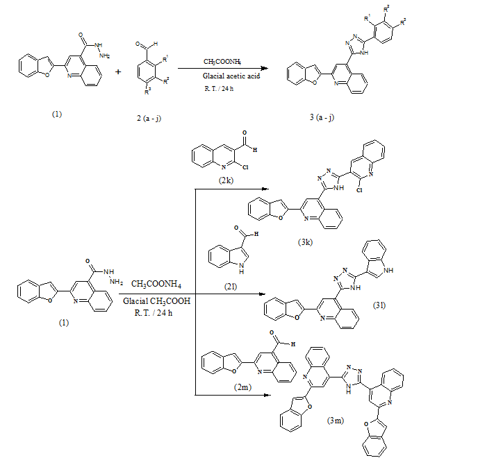 Scheme 1: Synthesis of 2-(1-benzofuran-2-yl)-4-(5-phenyl-4H-1, 2, 4-triazol-3-yl) quinoline and its derivatives 3(a-m)