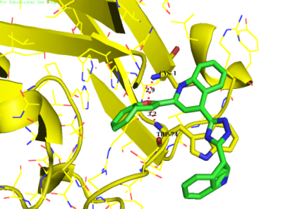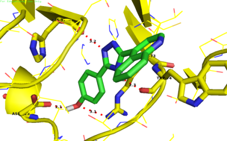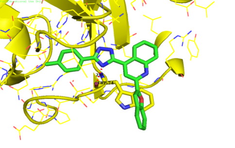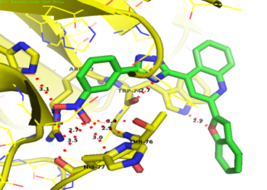 Fig. 1: Interaction of G6PDH with synthesized ligands of 2-(1-benzofuran-2-yl)-4-(5-phenyl-4H-1, 2, 4-triazol-3-yl) quinoline and its derivatives 3(a-m), The protein is represented as yellow cartoons. The interacting residues (yellow color), The ligands (green color) are represented as sticks. The hydrogen bonds are represented as red dotted lines
