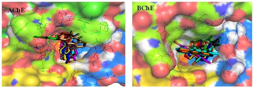 Fig. 1: Binding of alkaloids in active site of AChE and BChE. The alkaloids are represented in stick format