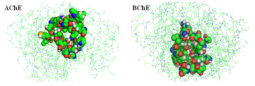 Fig. 3: The active site amino acids of the AChE and BChE, amino acids are represented in spheres