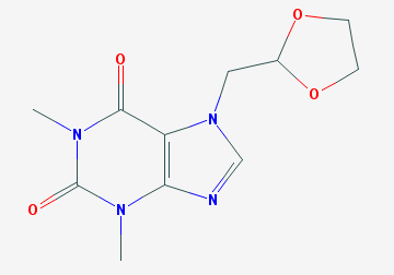 DOX is chemically 7(1,3 dioxolone-2-yl-methyl)-1,3-dimethylpurine-2,6-dione (fig. 2). It is bronchodilator xanthine drug which has the therapeutic properties of theophylline with lower incidence of side-effects [4]. Doxophylline do not affect gastric acid secretion; either in vivo or in vitro; unlike theophylline. The lack of side effects with DOX indicates that the drug can be used safely and effectively in the treatment of COLD. DOX inhibits phosphodiesterase (PDE IV) activities with consequent increase of cyclic AMP that determines relaxation of smooth musculature. DOX appears to have decreased affinities toward adenosine A1 and A2 receptors which may account for the better safety profile of the drug. DOX does not interfere with calcium influx into the cells or antagonize calcium channel blockers. Unlike aminophylline it has low secretagogue activity and suitable for asthmatic patients with peptic ulcer disease. DOX is used in the treatment of bronchial asthma, chronic obstructive pulmonary disease (COPD) and chronic bronchitis [5-6].