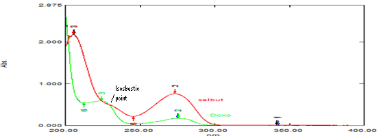 Fig. 3: UV overlay spectrum of SBS and DOX showing isoabsorptive point