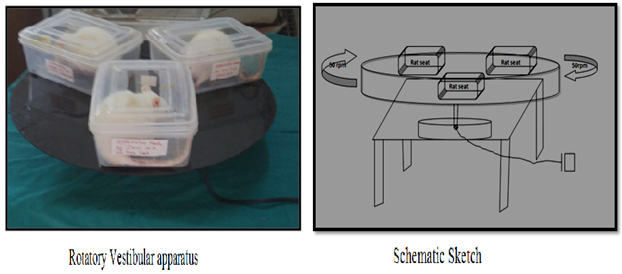 A new instrument has been designed in our laboratory for providing vestibular stimulation by rotations to find out whether learning and memory can be enhanced in rats through rotatory vestibular stimulation. This instrument was designed out of fibre frame as the basement with three plastic cages attached on it to place rats. The cages were off about 15 cm length and 10 cm width. Only one animal can occupy comfortably in one cage without any entrapment stress. The device works on electricity and the movement provided by this device gives vestibular stimulation in rotation mode. The speed of rotation was 50 revolutions per minute were fixed by trial and error method with 25 rpm and 75 rpm.