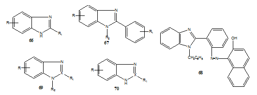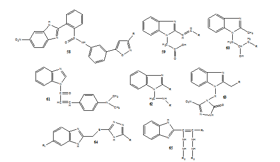 Neela et al. [63] synthesized benzimidazole isoxazoles 58 (fig. 7) by the reaction between 4-nitro-1,2-diaminobenzene, phthalic anhydride and p-amino acetophenone and gives N-(4-zcetylphenyl)-4-(5-nitro-1H-benzimidazol-2yl)benzamide and on condensation with different aldehydes yielded the chalcones, which are reacted with reagents like malononitrile and ammonium acetate, thiourea and hydroxylamine hydrochloride. All the compounds have been characterized elementary analysis. The synthesized compounds were evaluated for their antimicrobial and antitubercular activity. A new series of benzimidazoles acetic acid derivatives 59 (fig. 7) were synthesized by reacting 2(2-substitutedphenylethenyl)1H-benzimidazole with chloroacetic acid under reflux by Kale et al. [64]. All compounds were evaluated for antibacterial, antifungal and antitubercular activities. Most of the compounds have shown significant antibacterial, antifungal and antitubercular activity when compared with the standard drug.