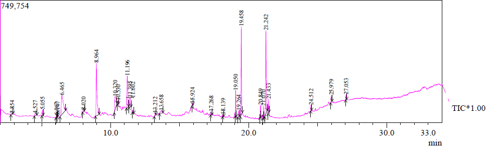 Fig. 1: Gas chromatography-mass spectrometry (GC-MS) chromatogram of methanol extract of Zizyphus spina christi leaves