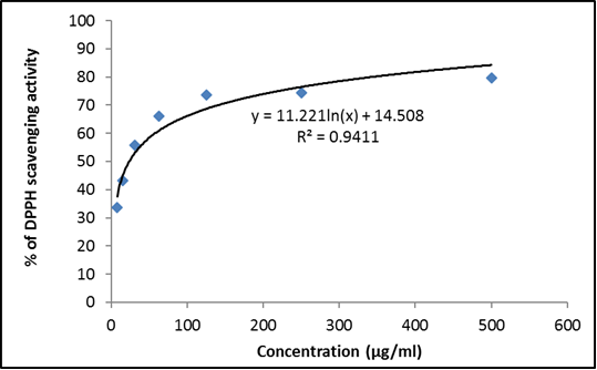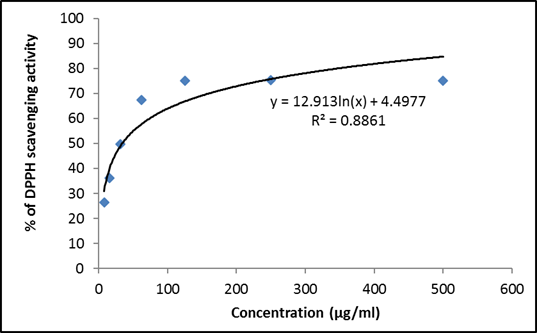-For methanol extract: y ꞊12.913 ln(x)+4.4977, IC50 value was 33.91µg/ml (fig. 3).
