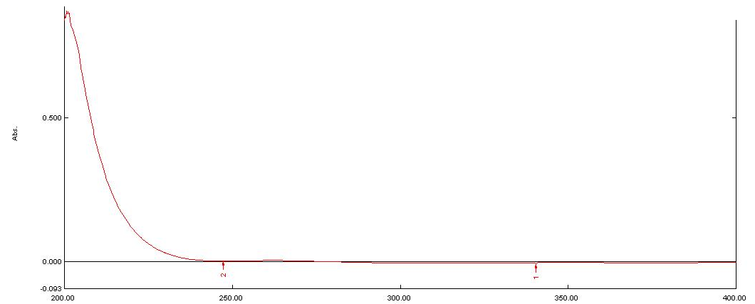 Suitable wavelength for the total experiment was determined by recording UV spectrum in the range of 200-400 nm for Acamprosate calcium and suitable wavelength selected was 208 nm (Figure 2).