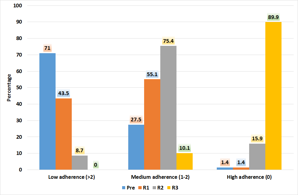 Medication adherence among patients was classified as low adherence, medium adherence and high adherence based on Morisky 8 item questionnaire. In baseline review 49 had shown low adherence, 19 shown medium adherences and 1 were highly adhered.