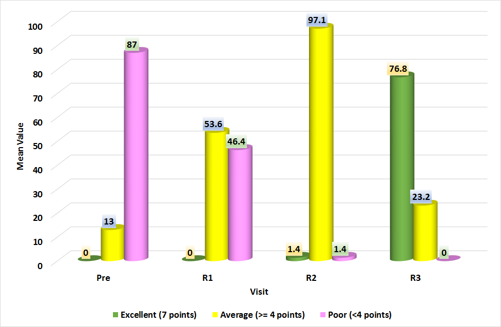Knowledge among the patients was classified under three categories excellent, average, and poor. In baseline review and first review all subjects were grouped in average and poor knowledge groups and there were no patients with excellent knowledge. In the final review, there were no patients with poor knowledge. 76.8% patients were found to have excellent knowledge in final review followed by 23.2% subjects with average knowledge as given in table 4. Mean knowledge of subjects was assessed, irrespective of age and gender knowledge of all subjects improved in the final review.