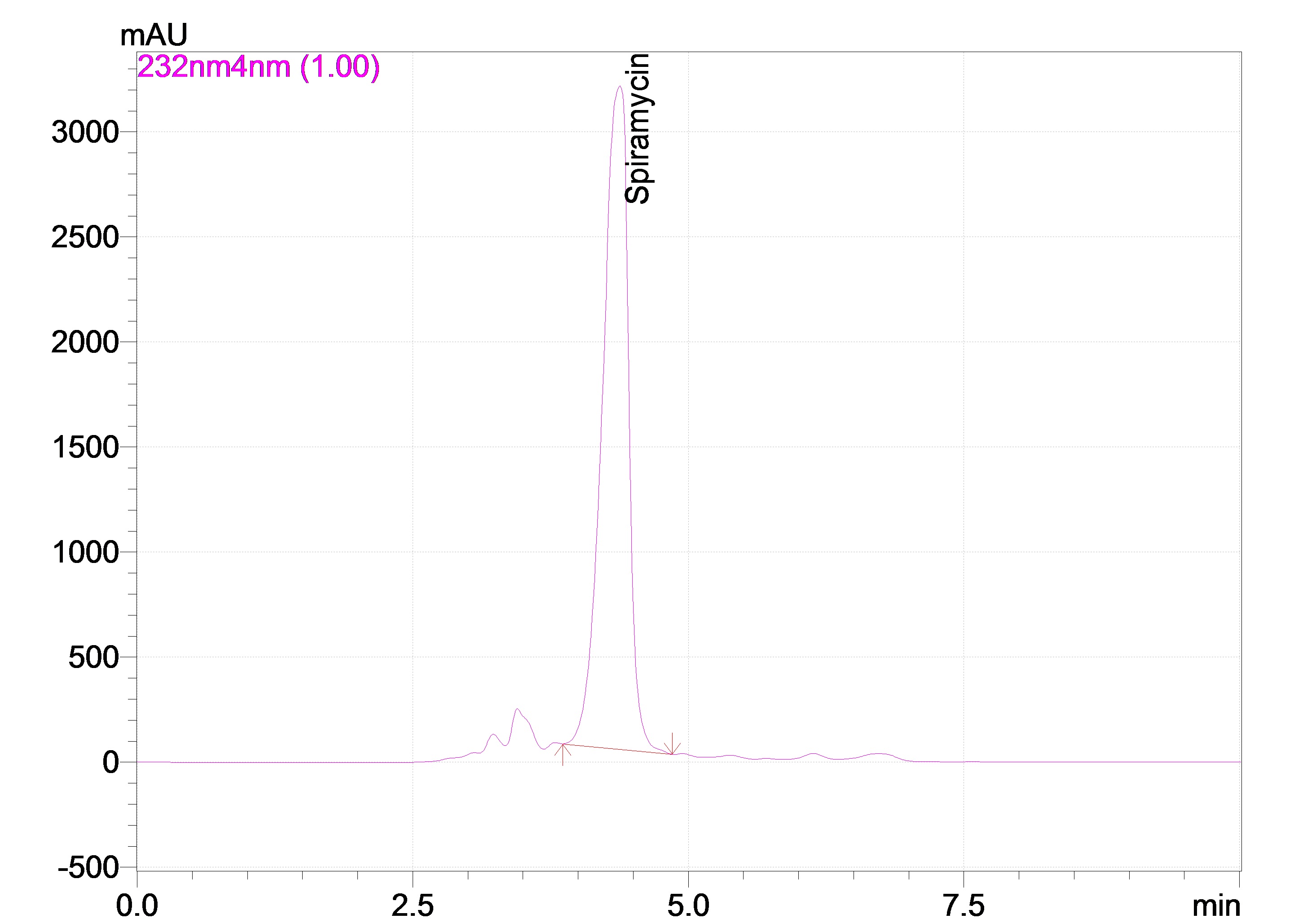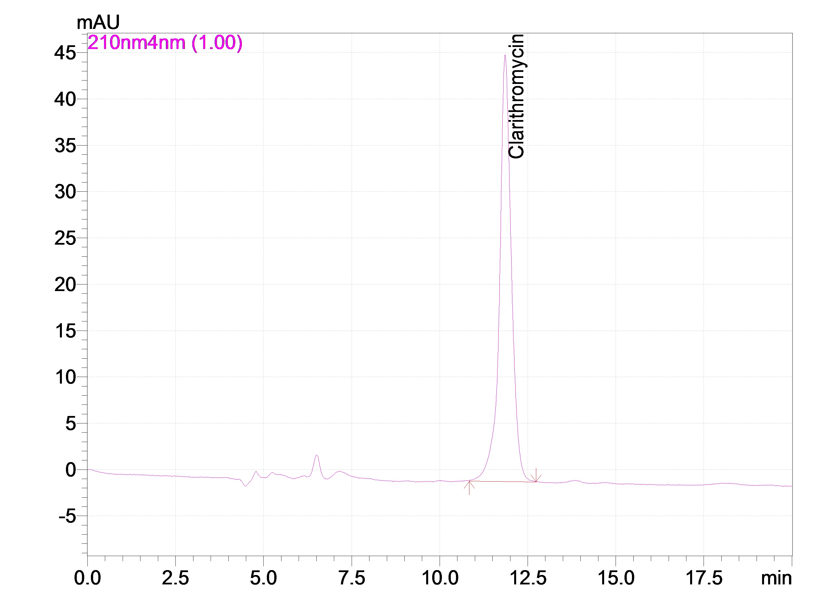 During the preparation of product sample for the testing of the specificity of clarithromycin, 10 tablets were weighed and grinded using a mortar and pestle. In the case of spiramycin, a sample was prepared as discussed previously described. For each drug sufficient sample powder was weighed, equivalent to result in a final drug concentration of 1000 µg/ml. Each sample was diluted with mobile phase. The flasks were shaken for 10 min using an ultrasonic shaker. Thereafter each sample was filtered through a 0.45 µm PVDF filter into HPLC vials.