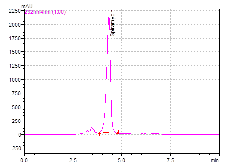 Fig. 3: Chromatograms obtained for spiramycin during specificity testing with chromatogram (a) showing the peak obtained for spiramycin from a standard solution and (b) showing the peak obtained for spiramycin detected from a commercial sample
