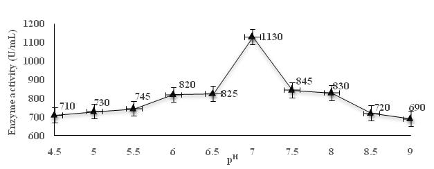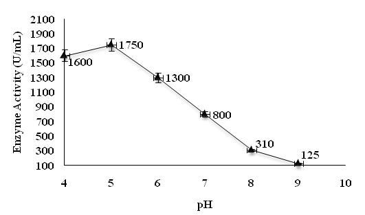 The production medium was adjusted at different pH levels such as pH 4.0 to 9.0 using 0.2 molar with specific buffer solutions. One ml of uniformly prepared spore suspension (105spores ml-1) from 7 d old cultures was used as inoculums. Inoculated medium was incubated at 37 °C in orbital shaker for 48 h at 100 rpm and then estimated its enzyme activity.