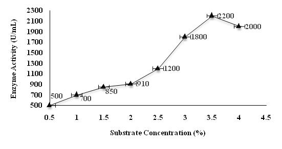 To study the effect of substrate concentration on enzyme production, 1 ml of uniformly prepared spore suspension (105spores ml-1) from 7 d old cultures was used as inoculum and incubated at different substrate concentrations such as 1% to 4%. Inoculated medium was incubated at 37 °C in orbital shaker for 48 h at 100 rpm and then estimated its enzyme activity.