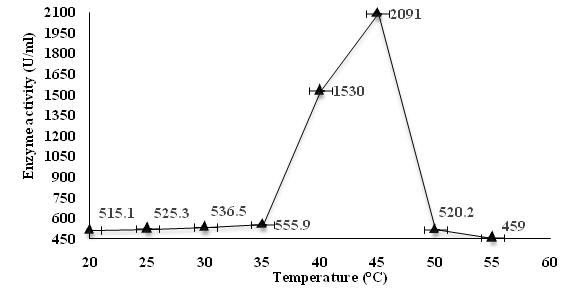 The activity of the partially purified enzyme was determined at various temperatures ranging from 20 °C to 55 °C. From the results (fig. 8), it showed that at 45 °C enzyme production was maximum with the enzyme activity of 2091 U/ml.