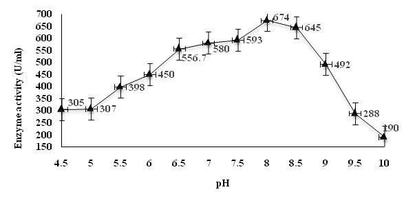 Buffer with different pH of 4.5 to 9.5 was prepared [11]. Reaction buffer (2 ml) with different pH was taken in a test tube, and 0.1 ml of enzyme sample was added. The samples were incubated at 37 °C for 5 min. After incubation, the reaction was stopped by adding 3 ml (10%) of ice cold TCA [10]. The reaction mixture was filtered, and enzyme activity was measured [7].