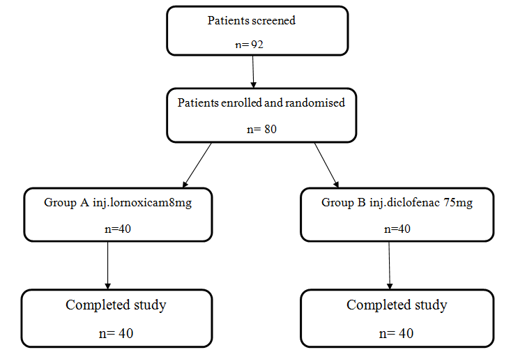 For a period of one year from April 2014 to May 2015, 92 patients (44 male patients and 48 female patients) were assessed for eligibility based on the inclusion and exclusion criteria. 80 patients were enrolled for the study and they were randomised into two groups. Group A (n = 40) received injection lornoxicam 8 mg and group B (n = 40) received injection diclofenac 75 mg and all the patients in both the groups completed the study.
