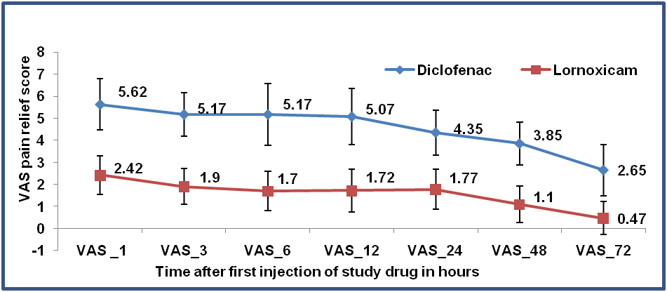 Graphical representations of VAS score of lornoxicam and diclofenac group.