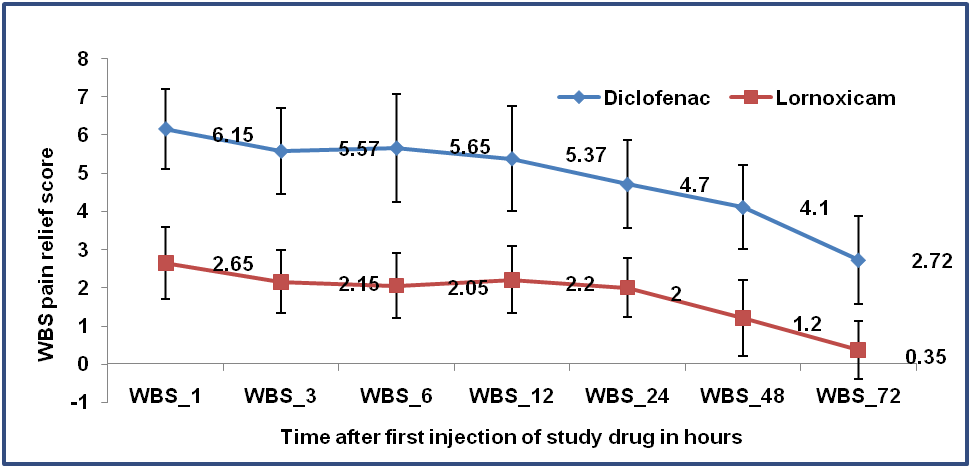 Graphical representation of WBS pain score of lornoxicam and diclofenac group.