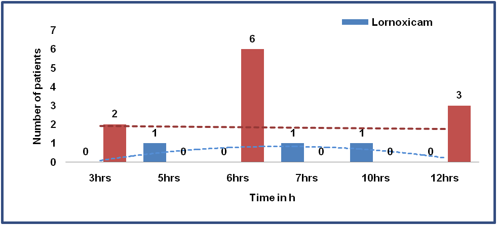 In diclofenac group, 2 patients required rescue medication at 3 h after the first dose, 6 patients required rescue medication 6 h following the first dose of the drug and 2 patients at 12 h following the first dose. In lornoxicam group, only one patient required rescue medication at 5hours, 6hours and 10 h. Based on the comparison of trend line between the two groups, more number of patients utilised the rescue drugs in the diclofenac group between 3rd to 12th hours following first dose than lornoxicam group (fig. 3). The maximum number of patients who required rescue medication was in diclofenac group in the 6th hour following the first dose of the analgesic.
