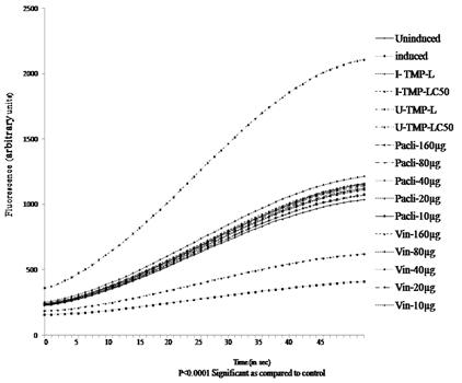 Fig. 2: Graph illustrates the fluorescence produced by uninduced and induced S. Typhi after its treatment with trimethoprim (lethal and sub-lethal), paclitaxel (160μg/ml, 80μg/ml, 40μg/ml, 20 μg/ml and 10 μg/ml respectively) and vinblastine (160μg/ml, 80μg/ml, 40μg/ml, 20 μg/ml and 10 μg/ml respectively)