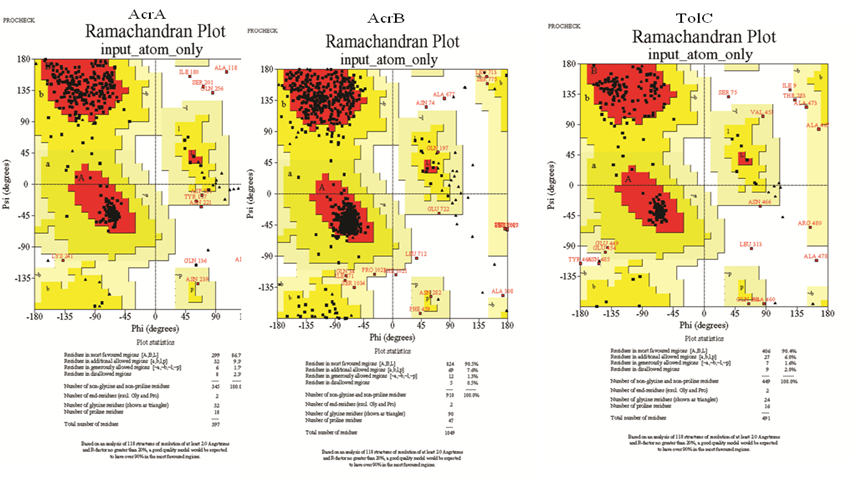 Fig. 3: Ramachandran plots of protein subunits of AcrAB-TolC Salmonella Typhi, AcrA (86.7%), AcrB (90.5%), TolC (90.4%). Black dots representing the amino acids and red region representing the favorable zone